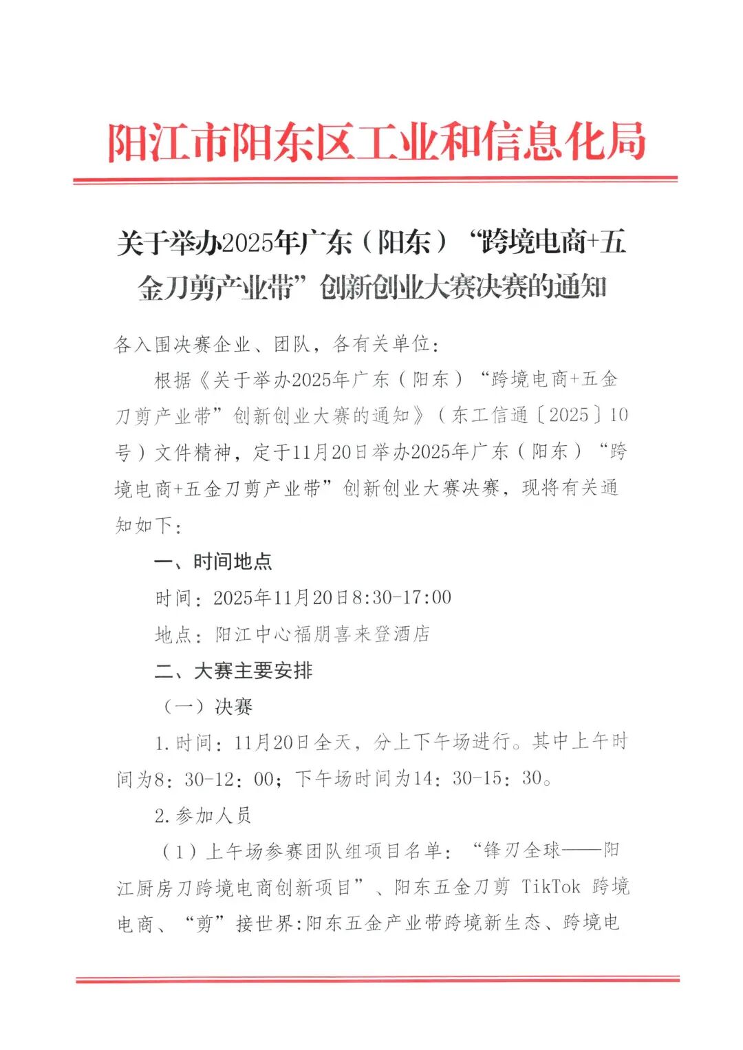 接主办方通知,大赛组委会将定于2025年11月20日举办【刀剪出海·“阳”帆未来——2025年广东(阳东)“跨境电商+五金刀剪产业带”创新创业大赛】决赛,通知文件详情如下: