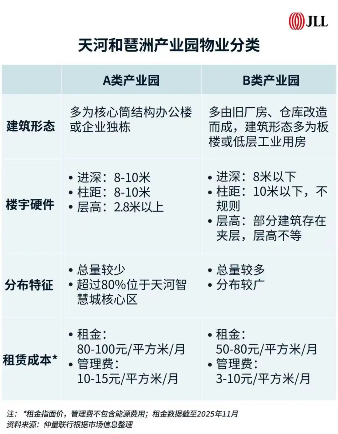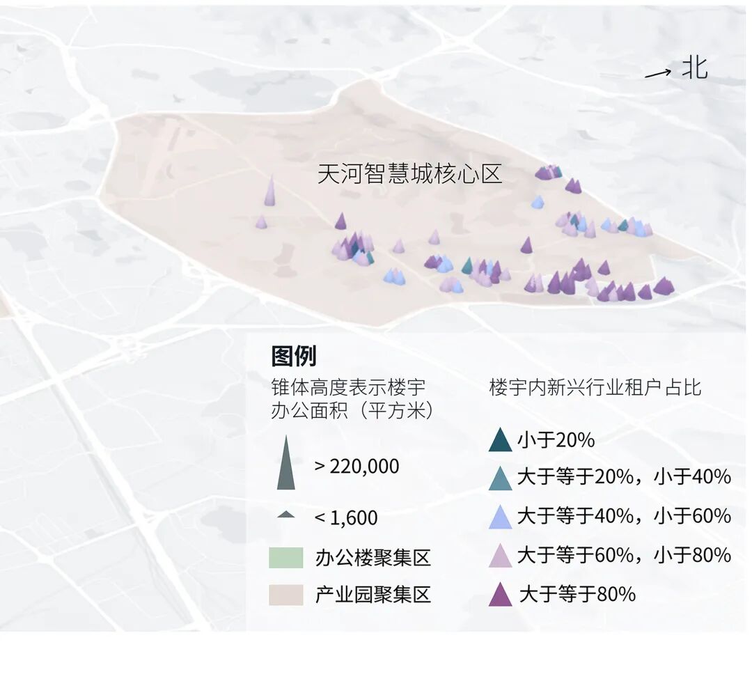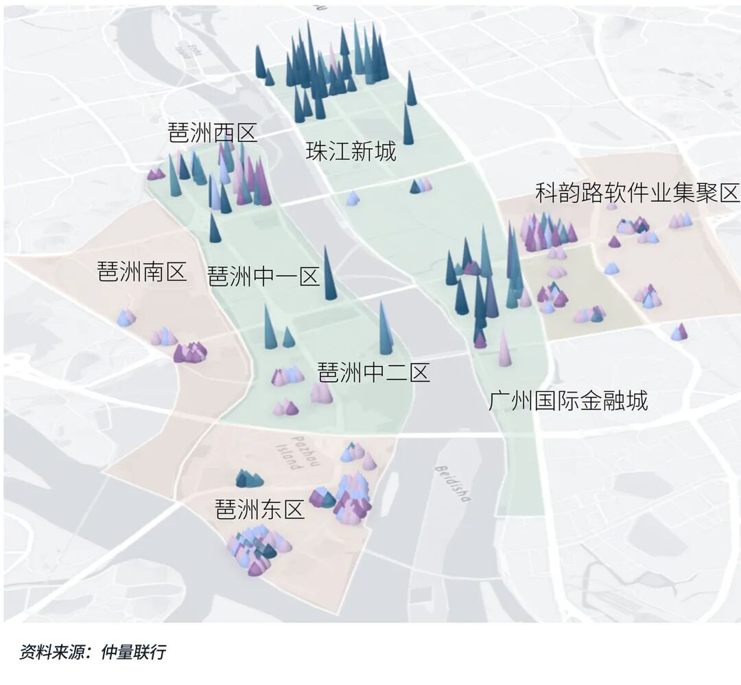 整体而言,广州的新兴行业企业广泛分布在各类产业园与办公楼中。仲量联行监测的天河区和琶洲片区中超300万平方米的项目样本显示,仅三成产业园物业达到A类产业园要求。