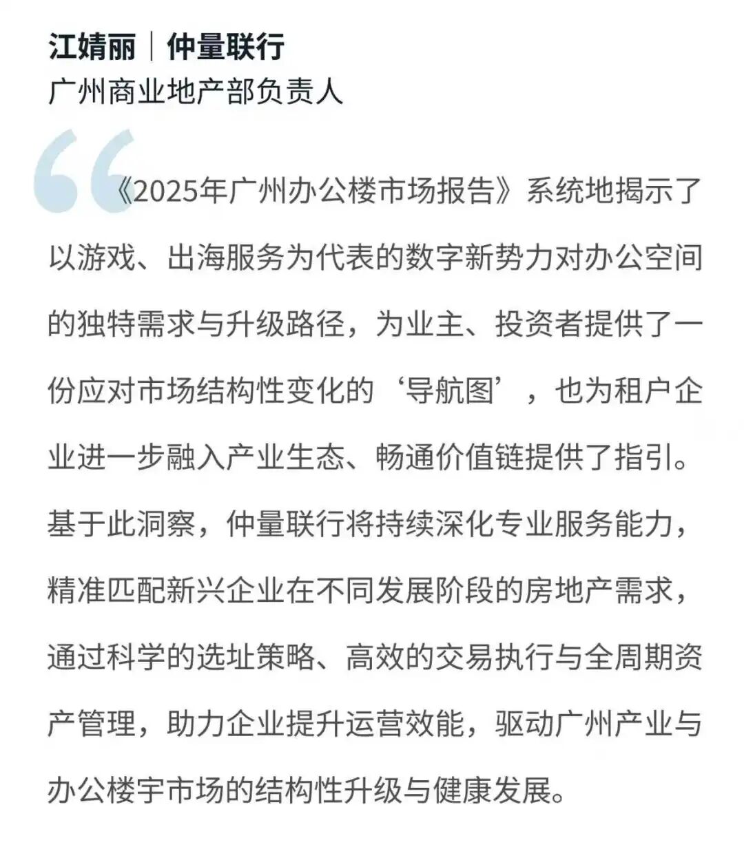 近年来,游戏、出海服务等新兴产业在广州加速集聚,企业办公空间升级与商业场景布局需求持续释放,成为驱动甲级办公楼租赁需求的新势力。在此背景下,仲量联行全新发布《聚焦数字新势力,重塑楼宇生态圈——2025年广州办公楼市场白皮书》,深入剖析新兴行业的选址逻辑与搬迁趋势,为业主优化资产策略、打造适配新一代企业需求的办公产品提供了决策指引,也明确了广州办公楼市场动能转换的核心方向。